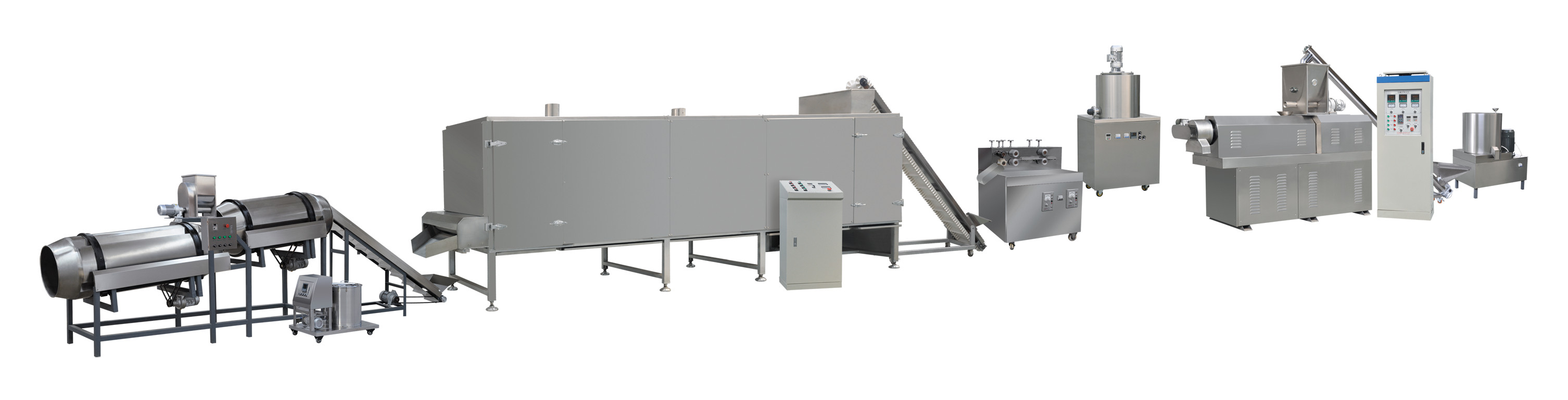 拌粉机→上料机→膨化机→风送机/提升机→多层烤箱→冷却机→喷油机→滚筒→→提升机→震动筛→→(包装机)